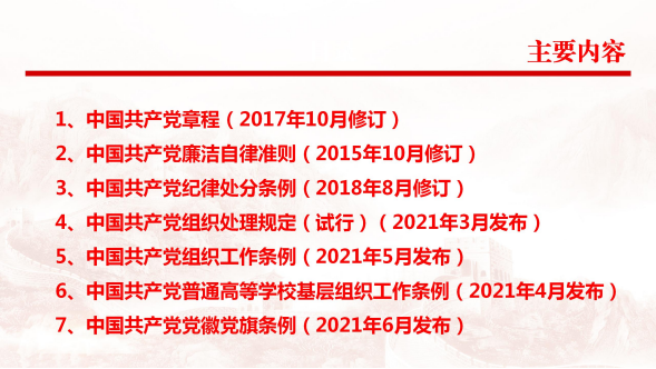 刘逸书记传达了习近平总书记关于党章党规的重要论述,带领大家认真学习了《中国共产党章程》《中国共产党廉洁自律准则》《中国共产党纪律处分条例》《中国共产党组织处理规定(试行)》的重要内容,并详细解读了《中国共产党组织工作条例》《中国共产党普通高等学校基层组织工作条例》和《中国共产党党徽党旗条例》。