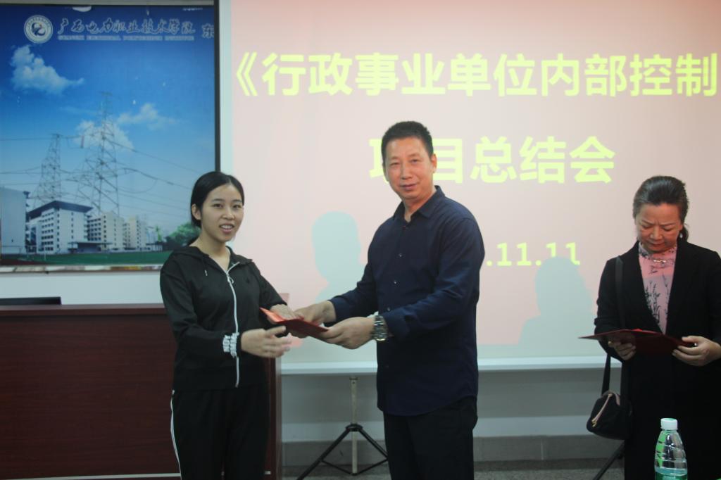 会议伊始,合强软件有限责任公司总经理李妙楠反馈了我系培优班学生工作完成的情况,并指出了学生工作过程中的不足,提出了改进意见。随后,学生代表谈实训收获以及体会。南宁市合强软件有限责任公司董事长李云阁就广西企业参与行政事业单位内部控制评估等方面发表讲话,在讲话结束就给培优班的学员颁发《行政事业单位内部控制实训考核合格证书》。