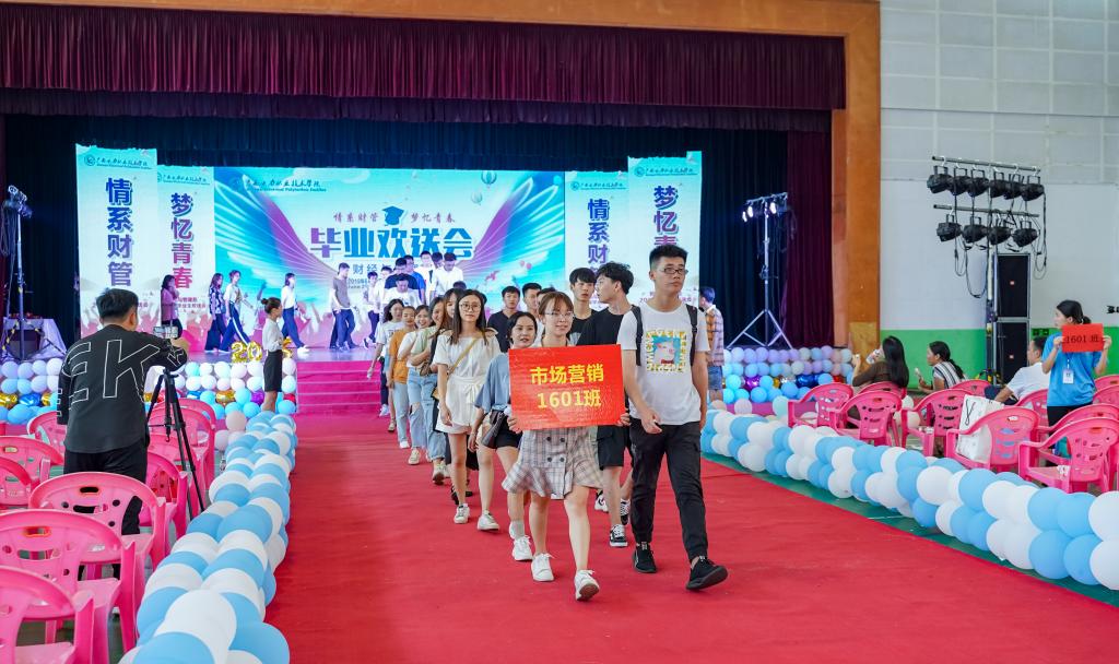 欢送会在2019届毕业班级创意红毯秀中拉开序幕,毕业生们从舞台走过红毯来到毕业背景墙前面和领导老师合影留念,随后落座观众席,与老师们共同观看视频。该视频记录了毕业班的同学从2016年入校到毕业的点点滴滴,勾起了同学们三年来的回忆。
