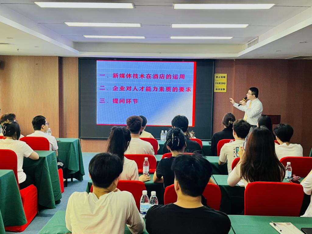 财管2115班的同学们在酒店总经理蔺宝东的带领下参观了酒店的环境设施、了解酒店的基本运作。随后,蔺总经理从新媒体技术在酒店中的运用和企业对人才能力素质的要求等方面,为同学们呈上一堂生动有趣、精彩纷呈的课程。最后,蔺总经理强调,大学生在未来的求职就业中要对自己有精准定位,要有空杯心态,善于向他人学习,脚踏实地,重视自身综合素质的提升,从而提高自身的职场竞争力。