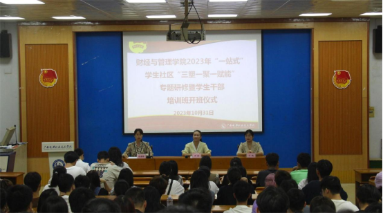 为深入学习宣传贯彻党的二十大精神、习近平新时代中国特色社会主义思想和习近平总书记关于青年工作的重要论述,进一步提高我院学生干部的综合素质,增强学生干部的政治意识、全局意识、服务意识、责任意识和“一站式”学生社区建设的参与意识,10月31日下午,我院在科园校区2-101教室举行2023年“一站式”学生社区“三塑一聚一赋能”专题研修暨学生干部培训班开班仪式。学院党总支书记蒋莉出席本次开班仪式并担任主讲,党总支副书记许枫、全体专职辅导员出席会议,会议由学院团总支书记申惠敏主持。学院团总支、学生会全体学生干部以及各班班干共200余人参加本次培训。