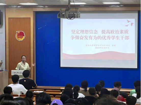 开班仪式结束后,蒋莉书记以“坚定理想信念,提高政治素养,争做奋发有为的优秀学生干部”为主题开展培训班的第一讲。蒋莉书记强调,我们要牢记习近平总书记的嘱托,坚定理念信念,补足精神之钙。蒋莉书记要求,作为学生干部,要提升自我管理、自我服务意识,勇于担当,积极作为,充分发挥模范带头作用,为实现中华民族伟大复兴的中国梦而奋斗。