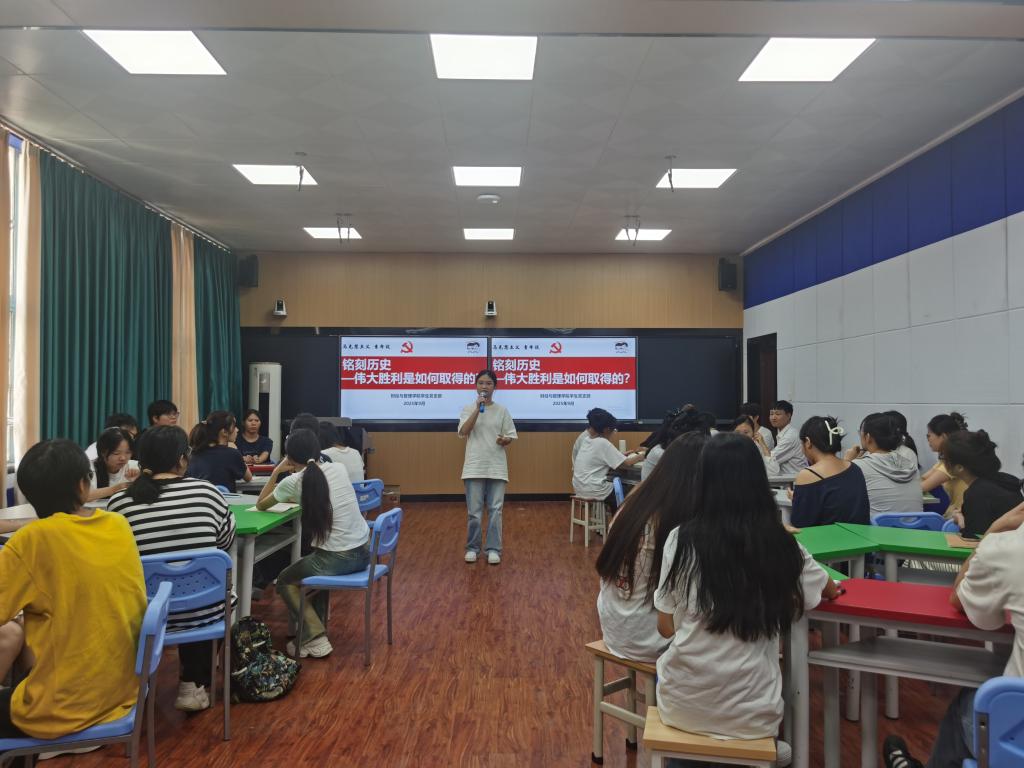 重温历史,缅怀先烈。通过影像资料与主题讲解,学生党支部书记蒲杨老师带领全体党员回顾了中国人民抗日战争和世界反法西斯战争的艰苦卓绝与伟大胜利。