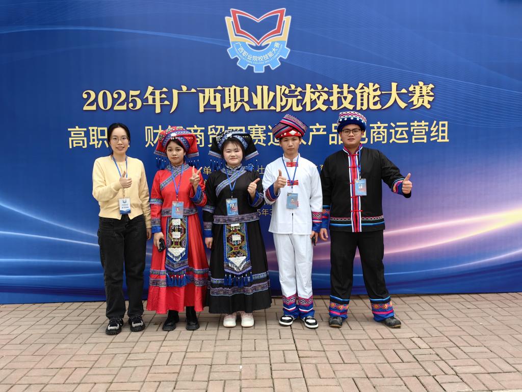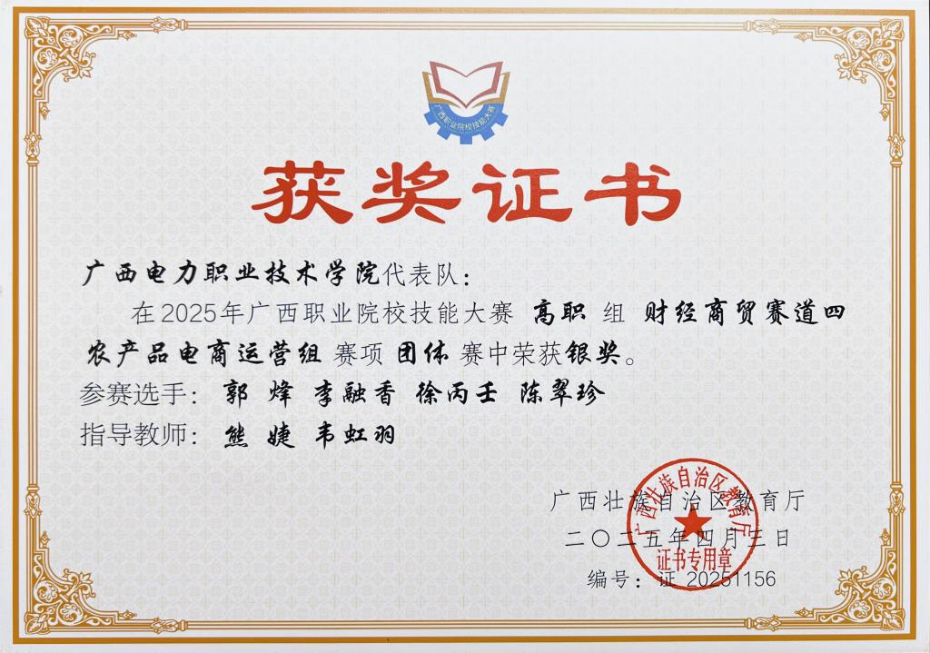 3月17日-3月19日,2025 年广西职业院校技能大赛高职组财经商贸赛道农产品电商运营赛项成功举办。我院郭烽、李融香、徐丙壬、陈翠珍四位学子,在熊婕、韦虹羽两位教师的指导下,凭借过硬专业能力与出色团队协作,从全区57 支参赛队伍中脱颖而出,最终斩获省部级 A 类赛事银奖,为学校赢得荣誉。