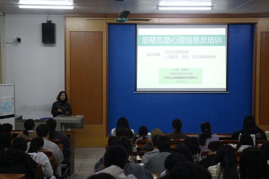 为完善校园心理健康防护网络,提升学生骨干的朋辈心理互助能力,我院于2025年11月5日下午,在1-101教室举办2025级心理信息员专项培训会。本次培训由大学生心理健康教育与咨询中心教师阳秀英教授主讲。